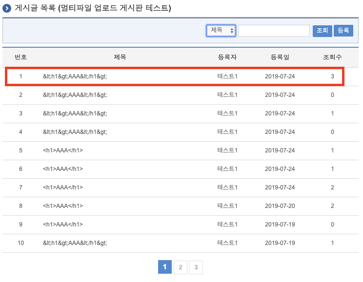 그 다음 리스트를 가보면, 아래와 같이 htmlTagFilter가 동작되어 필터된 제목을 보실 수 있으실 겁니다.