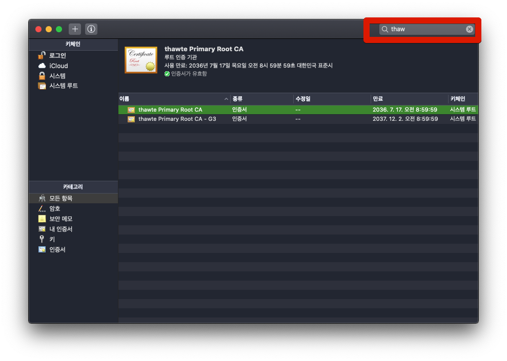 아래와 같이 상단검색창에 thawte 검색 후 모두 삭제
