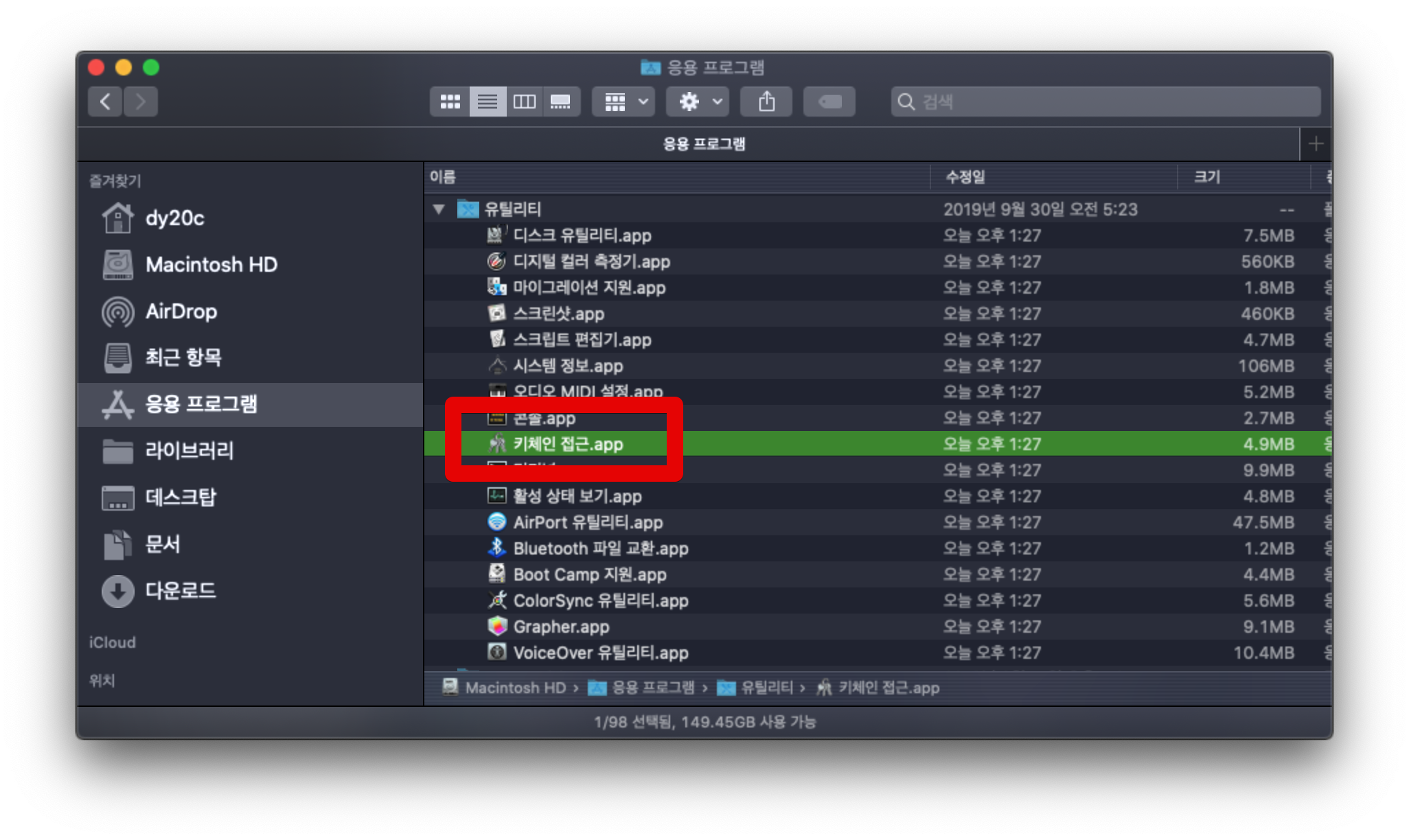 finder > 응용프로그램 > 유틸맅 > 키체인 접근.app 클릭